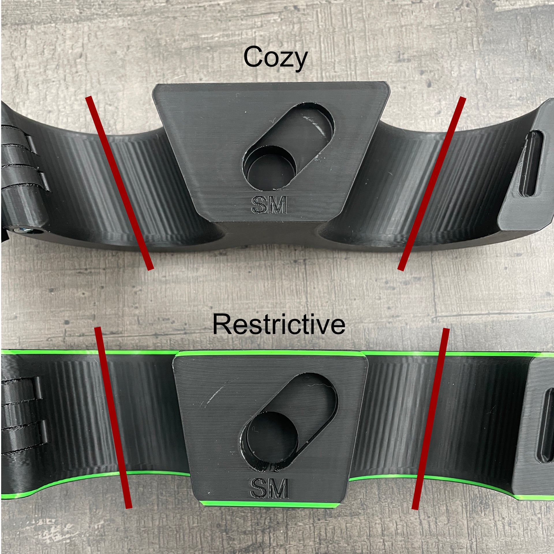 De "Restrictieve" variant heeft een kleinere hoek, waardoor de armen en ellebogen meer naar elkaar toe worden geforceerd. Deze variant is daardoor een stuk minder comfortabel, en zal door de meeste mensen alleen aan de voorzijde van het lichtaam gedragen kunnen worden.